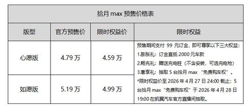 预售期间支付 99 元订金,即可尊享以下三大权益:1.膨胀礼:订金直抵2000元车款2.畅充礼:赠送充电桩(不含安装,可选充电枪)3.奢享礼:抽取5台拾月max “免费购车权”。*限时权益价至2026年4月27日 24:00截止;5台拾月max“免费购车权”于2026年4月28日19:00在凯翼汽车官方直播间抽取。