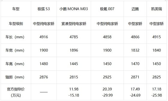 要知道,这个尺寸不仅比市面上多数热销的10万级纯电家轿大一圈,甚至超越了凯美瑞、迈腾等经典燃油B级车。这意味着,以前要花二十万才能拥有的中型车空间,现在极狐S3用10万级就给你了。即便把它和不少热门中大型轿车放在一起,尺寸也基本相当。