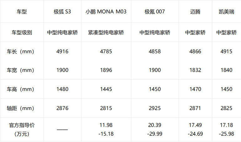 要知道,这个尺寸不仅比市面上多数热销的10万级纯电家轿大一圈,甚至超越了凯美瑞、迈腾等经典燃油B级车。这意味着,以前要花二十万才能拥有的中型车空间,现在极狐S3用10万级就给你了。即便把它和不少热门中大型轿车放在一起,尺寸也基本相当。