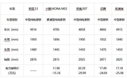 要知道,这个尺寸不仅比市面上多数热销的10万级纯电家轿大一圈,甚至超越了凯美瑞、迈腾等经典燃油B级车。这意味着,以前要花二十万才能拥有的中型车空间,现在极狐S3用10万级就给你了。即便把它和不少热门中大型轿车放在一起,尺寸也基本相当。