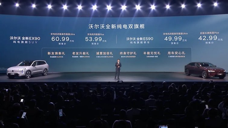 与此同时,沃尔沃全新纯电双旗舰开启预售。其中,EX90预售价53.99万元-60.99万元,ES90预售价42.99万元-49.99万元。