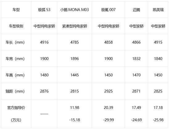 要知道,这个尺寸不仅比市面上多数热销的10万级纯电家轿大一圈,甚至超越了凯美瑞、迈腾等经典燃油B级车。这意味着,以前要花二十万才能拥有的中型车空间,现在极狐S3用10万级就给你了。即便把它和不少热门中大型轿车放在一起,尺寸也基本相当。