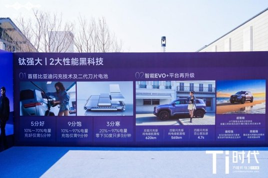 首先是两大性能黑科技,一个是比亚迪闪充技术及二代刀片电池,在常温环境下,钛3闪充版充电10-70%只需约5分钟,10-97%只需约9分钟,在零下30度的低温环境中也只多了3分钟,“5分好9分饱3分寒”让用户再无充电焦虑。