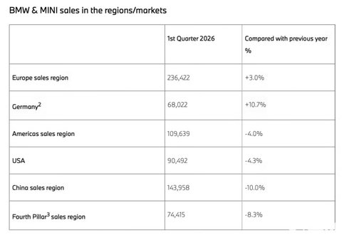 2026年4月,宝马集团如期交出第一季度成绩单。全球交付56.57万辆,同比下降3.5%;在华销量14.4万辆,同比降幅达10%。