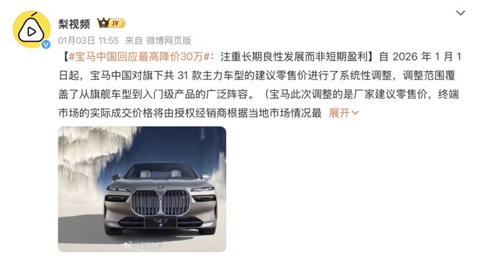 2026年1月1日,宝马终于低下了高傲的头颅,对31款主力车型全面下调官方指导价,其中旗舰电动车型i7 M70L直降30.1万元,超七成车型降幅超过10%。