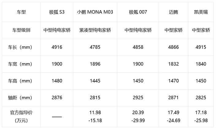 要知道,这个尺寸不仅比市面上多数热销的10万级纯电家轿大一圈,甚至超越了凯美瑞、迈腾等经典燃油B级车。这意味着,以前要花二十万才能拥有的中型车空间,现在极狐S3用10万级就给你了。即便把它和不少热门中大型轿车放在一起,尺寸也基本相当。