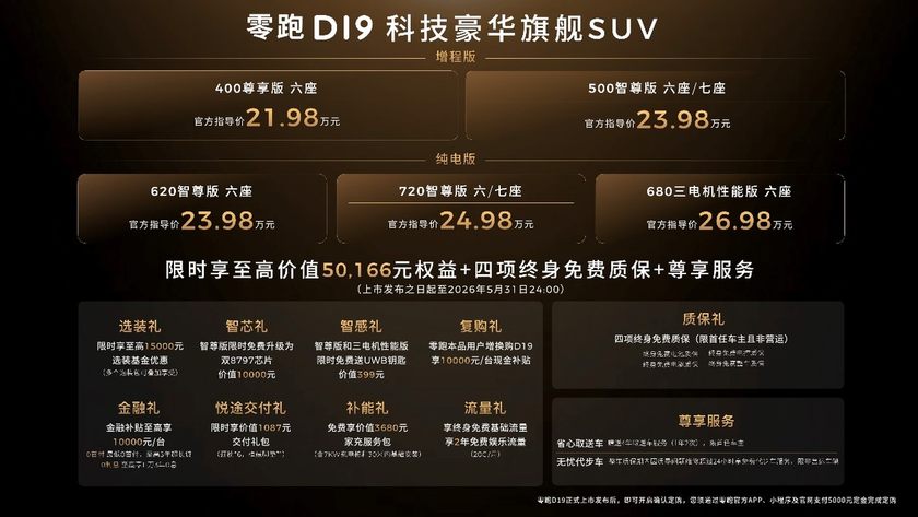 2026年4月16日,零跑旗舰D平台首款车型——零跑D19正式上市,售价21.98-26.98万元。新车定位“科技豪华旗舰SUV”,以旗舰级的美学、舒适、续航、智能、驾控、安全六大全维体验,彻底打破“旗舰即高价”的行业陈规,旨在重塑30万内全尺寸SUV的价值标杆,让真正的旗舰体验成为更多家庭的幸福之选。发布会现场,零跑D系列代言人费翔先生亲临助阵,零跑科技创始人、董事长、CEO朱江明先生为费翔交付首台零跑D19,双方共同见证这款旗舰车型正式上市,标志着零跑品牌向上与科技普惠迈入全新阶段。