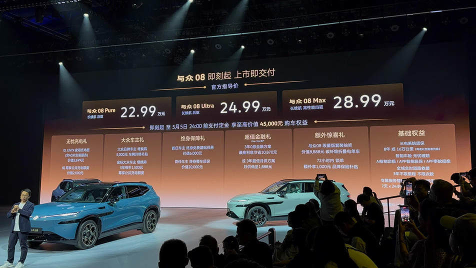 在深圳完成上市发布的与众08,定位全时互联全尺寸纯电SUV,提供Pure、Ultra、Max3个版本,官方指导价分别为22.99万元、24.99万元和28.99万元。新车同步推出多项限时权益,5月5日24:00前支付定金,可享至高价值4.5万元购车权益。