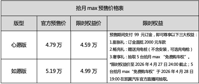 预售期间支付 99 元订金,即可尊享以下三大权益:1.膨胀礼:订金直抵2000元车款2.畅充礼:赠送充电桩(不含安装,可选充电枪)3.奢享礼:抽取5台拾月max “免费购车权”。*限时权益价至2026年4月27日 24:00截止;5台拾月max“免费购车权”于2026年4月28日19:00在凯翼汽车官方直播间抽取。