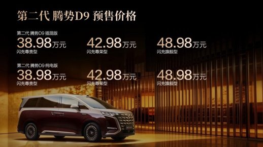 本次下线的第二代腾势D9,正是比亚迪核心技术的集大成之作,新车预售价为38.98万-48.98万。作为全球首款搭载第二代刀片电池的量产MPV,该车搭载比亚迪第二代刀片电池,续航实力全面突破:插混车型纯电续航达 401km,纯电车型续航高达 800km;并带来“5分钟充好,9分钟充饱,零下30℃充电仅多3分钟”的颠覆性充电体验。第二代腾势D9的长续航+闪充黄金组合,实现充电自由 + 时间自由 + 出行自由,让用户真正零焦虑。在智能化领域,新车全系标配天神之眼5.0智能驾驶系统,采用行业领先的全闭环端到端架构,具备自主强化学习能力,可依托海量真实驾驶数据持续迭代进化,实现更平稳的驾驶、更精准的泊车、更迅捷的反应,为用户全程保驾护航。在设计方面,新车内饰采用全新的设计语言,中排升级零压云绒座椅,以百万级的豪华标准,将豪华体验提升至全新维度。