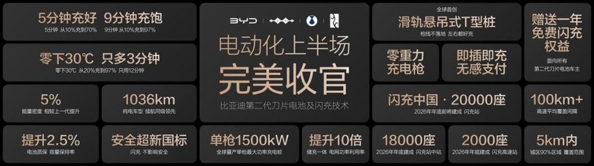 2025年全年,比亚迪累计销量突破460万辆,斩获中国汽车市场车企销量冠军;海外销量突破104万辆,出海足迹覆盖全球119个国家和地区,在多国新能源汽车市场位居销量榜首。比亚迪长期坚守“技术为王”理念,2025年全年研发投入达634亿元,累计研发投入突破2400亿元。2026年3月,比亚迪发布第二代刀片电池及闪充技术,一举攻克了电动化上半场“充电慢”和“低温充电难”的世界性难题,电动化上半场至此完美收官。同时,比亚迪发布“闪充中国”战略,年底将在全国建设20000座闪充站,让用户充电更自由、更便捷,引领电动车进入闪充时代。