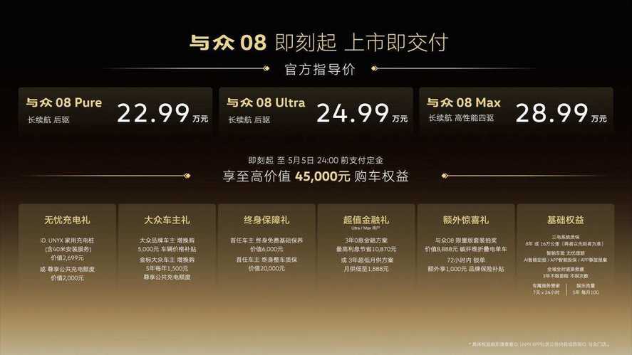2026年4月16日,深圳——当聚光灯打在“金标大众”的徽章上,一款名为“与众08”的全尺寸纯电SUV缓缓驶出。这不仅仅是大众汽车(安徽)数字化销售服务有限公司(以下简称“大众安徽销服”)交出的一份答卷,更可以被视为这家传统汽车巨头在中国新能源“决赛圈”发起的一次关键性反攻。新车推出Pure、Ultra、Max三款配置,价格区间锁定在22.99万元至28.99万元。这个定价,直接杀入了当前最内卷的20-30万级智能电动车市场腹地。
