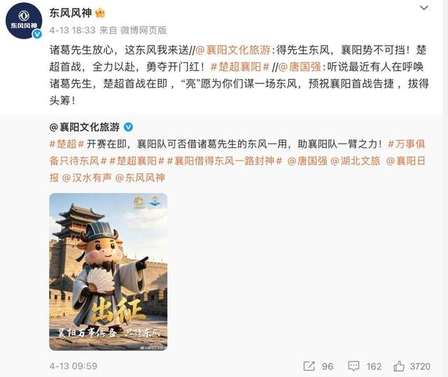 作为最深入人心的诸葛亮扮演者,唐国强老师在微博上为襄阳文旅展台,“亮”愿为你们谋一场东风!玩梗玩到本人身上,这场面也是让评论区直接沸腾:“迎接真神”、“诸葛出山,谁与争锋”、“楚超算是被东风风神玩明白了。”……一场业余联赛,硬是被这波带着文化底蕴的幽默操作带火,让楚超这个荆楚地区的足球联赛,整出了“破圈”的动静。