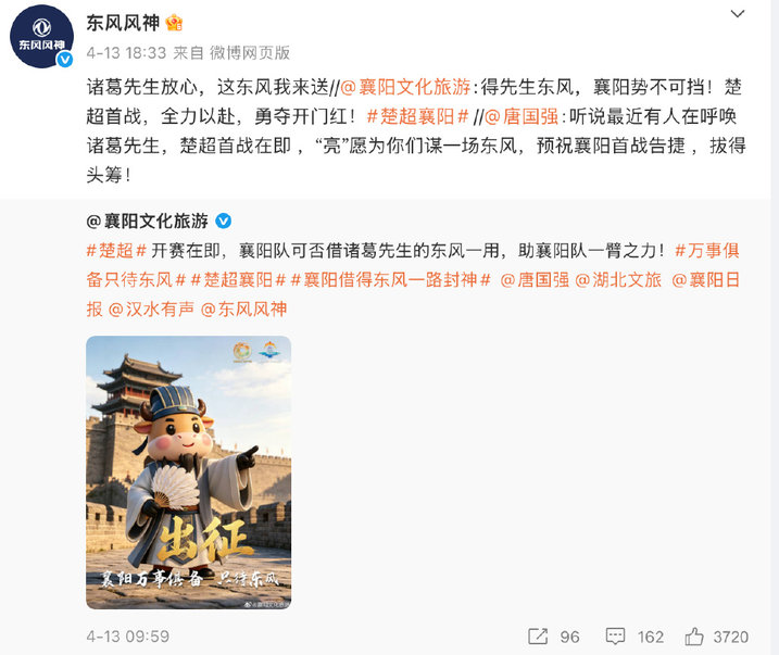 江湖路远,楚超正酣。楚超襄阳东风风神队的火热,恰是因为这个名字里,藏着襄阳千年的文化底气,藏着东风风神和这座城、和每一个普通人刻在骨子里的契合。用年轻人喜闻乐见的AI短剧形式,让沉睡的历史IP活过来;用心贴心的温暖互动,让本土全民赛事火起来;用全城联动的诚意,让襄阳的侠义风骨、烟火温情,被更多人看见……这就是东风风神想干的“大事”!