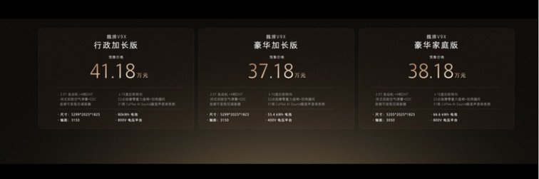 作为归元S平台的首款车型,也是归元S技术的首款落地旗舰,魏牌V9X定位“AI豪华六座旗舰”,共有三款车,其中豪华加长版预售价37.18万元,豪华家庭版预售价38.18万元,行政加长版预售价41.18万元,家庭版车长5205mm,轴距3050mm更适合家庭用户,加长版车长5299mm,轴距3150mm宜商宜家。