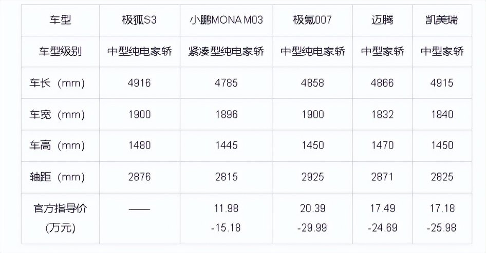 要知道,这个尺寸不仅比市面上多数热销的10万级纯电家轿大一圈,甚至超越了凯美瑞、迈腾等经典燃油B级车。这意味着,以前要花二十万才能拥有的中型车空间,现在极狐S3用10万级就给你了。即便把它和不少热门中大型轿车放在一起,尺寸也基本相当。