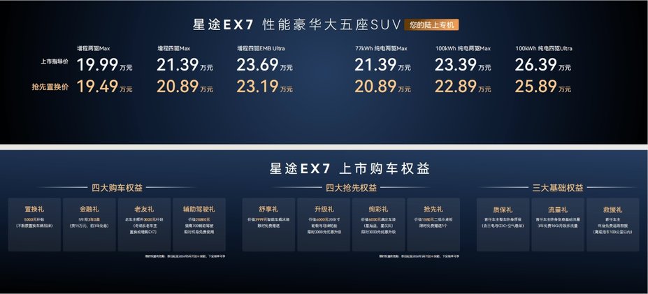 星途EX7提供纯电与增程双动力选择,共推出增程两驱Max、增程四驱Max、增程四驱EMB Ultra以及77kWh 纯电两驱Max、100kWh 纯电两驱Max、100kWh 纯电四驱Ultra六款车型,官方指导价为19.99万元—26.39万元,抢先置换价为19.49万元—25.89万元。与此同时,星途汽车官方还为用户提供了多重购车福利:包括置换礼、金融礼、老友礼、辅助驾驶礼四大购车权益;舒享礼、升级礼、绚彩礼、抢先礼四大抢先礼;此外,首任车主还可享受整车终身质保、终身免费基础流量、终身免费救援礼三大基础权益,让每位用户轻松拥有豪华奢享出行新体验。