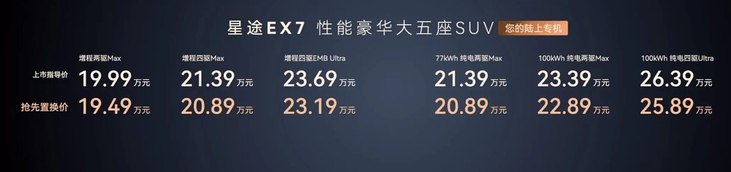 大家好,我是大李。没想到啊,星途来了个重磅消息。4月19号,星途EX7正式上市了,价格19.99万到26.39万元,要是算上抢先置换价,起步直接拉到了19.49万。如果光看价格,我觉得这价位放在一个轴距3米的中大型SUV身上,奇瑞这次确实是有点掀桌子的意思了。