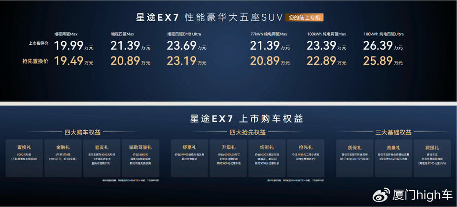 本次上市的星途EX7,推出增程两驱Max、增程四驱Max、增程四驱EMB Ultra、77kWh纯电两驱Max、100kWh纯电两驱Max、100kWh纯电四驱Ultra共六款配置,兼顾日常代步与长途出行场景。车辆同步推出置换补贴、金融方案、老车主专属福利、智能辅助驾驶体验等多项权益,首任车主可享整车质保、基础流量、道路救援等长期服务,降低用户用车与购车成本。