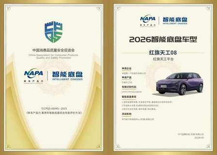 4月18日,在“中国消费品质量安全提升系列行动2026启动暨2026消费品行业系列研究报告发布”活动上,红旗天工08凭借“智、灵、顺、安”的出色表现,顺利通过《新车产品力 乘用车智能底盘综合性能评价方法》权威测评,斩获“2026智能底盘车型”荣誉称号,充分彰显出红旗研发在智能底盘领域的自主研发实力。