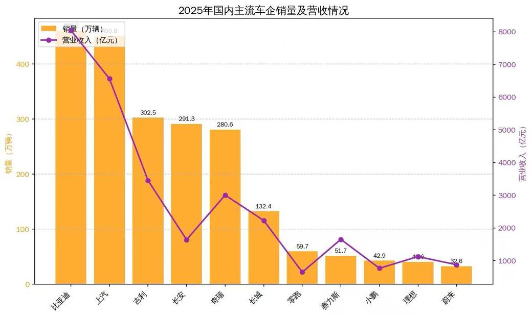 从营收维度来看,头部车企的规模优势进一步凸显。比亚迪以8040亿元的营收规模稳居行业榜首,展现强大的经营实力。上汽、吉利、长安、奇瑞依次位列第二至五位。2025年,比亚迪销量达460.2万辆,连续多年保持高增长态势。上汽集团、吉利汽车、长安汽车、奇瑞汽车分别以450.8万辆、302.5万辆、291.3万辆、280.6万辆紧随其后。
