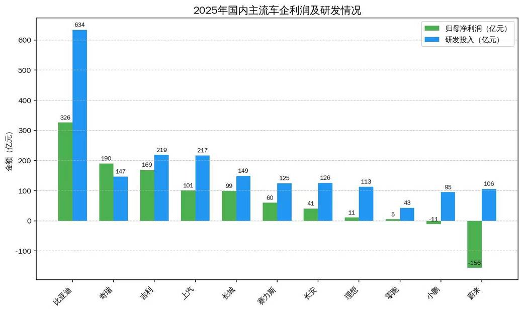 2025年,比亚迪研发投入达634亿元,同比增长17%;吉利、上汽、长城、奇瑞研发投入分别为219亿元、217亿元、149亿元、147亿元,分列第二至五位。值得注意的是,比亚迪一家的研发投入,已超过吉利、长城、奇瑞三家企业的研发投入之和。