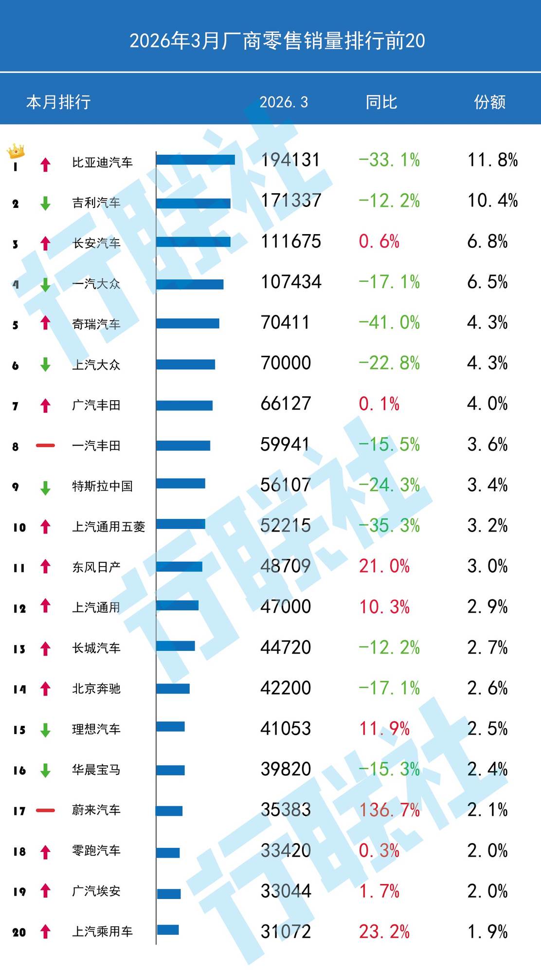 3月吉利同比增长-12.2%【一张图看清车市沉浮2026年3月厂商TOP20】