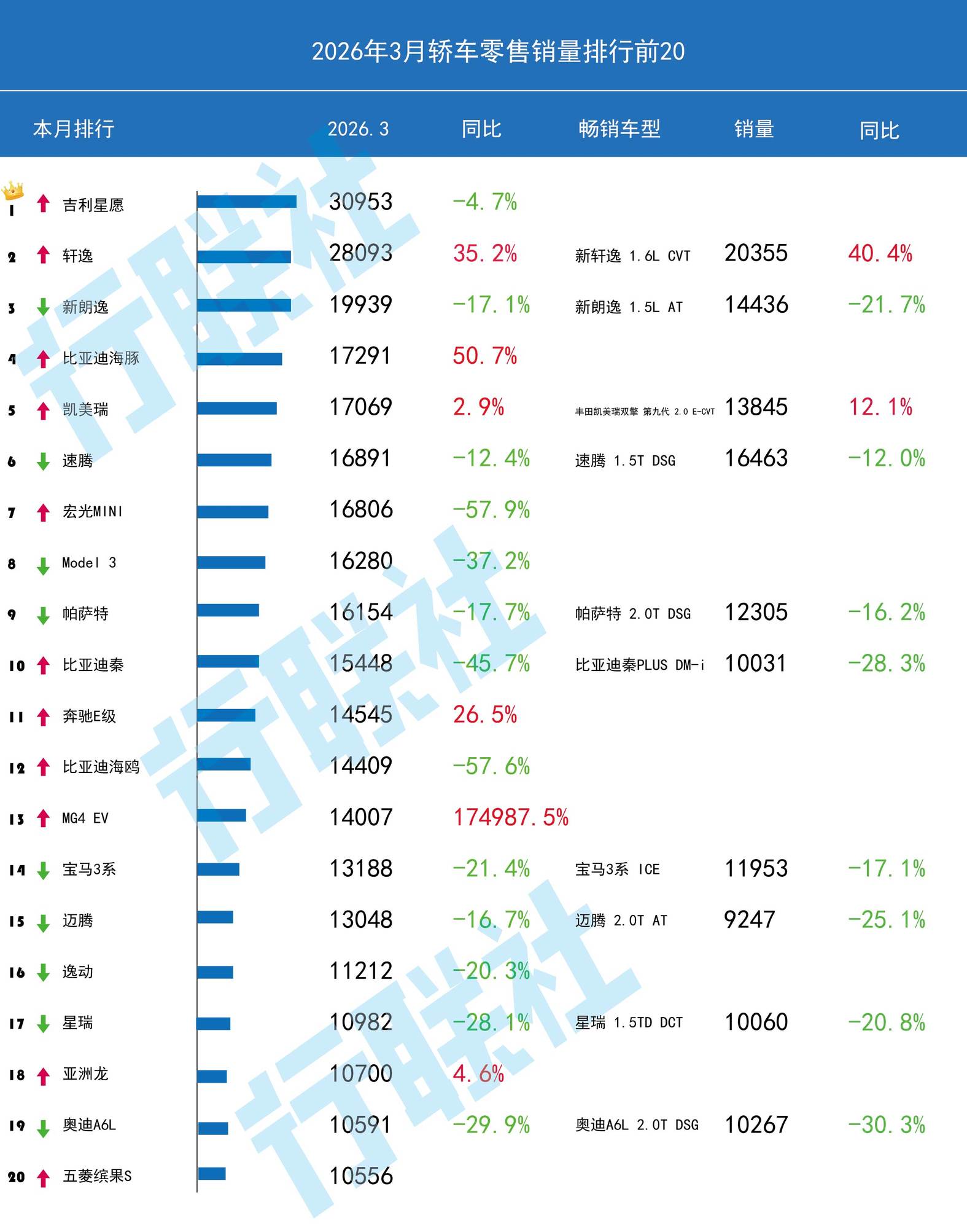 3月轿车同比增长-33.1%【一张图看清车市沉浮2026年3月轿车TOP20】