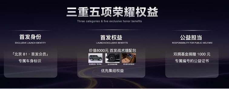 1. 专属首发身份权益盲订且最终购车的用户,将获授「北京 81・首发会员」荣誉身份,并授予线上勋章和实体徽章。首发车型将在车身多处,镌刻首发车印记,打造专属身份标识。