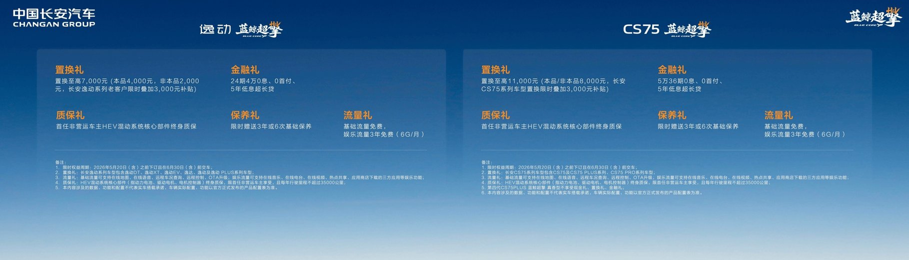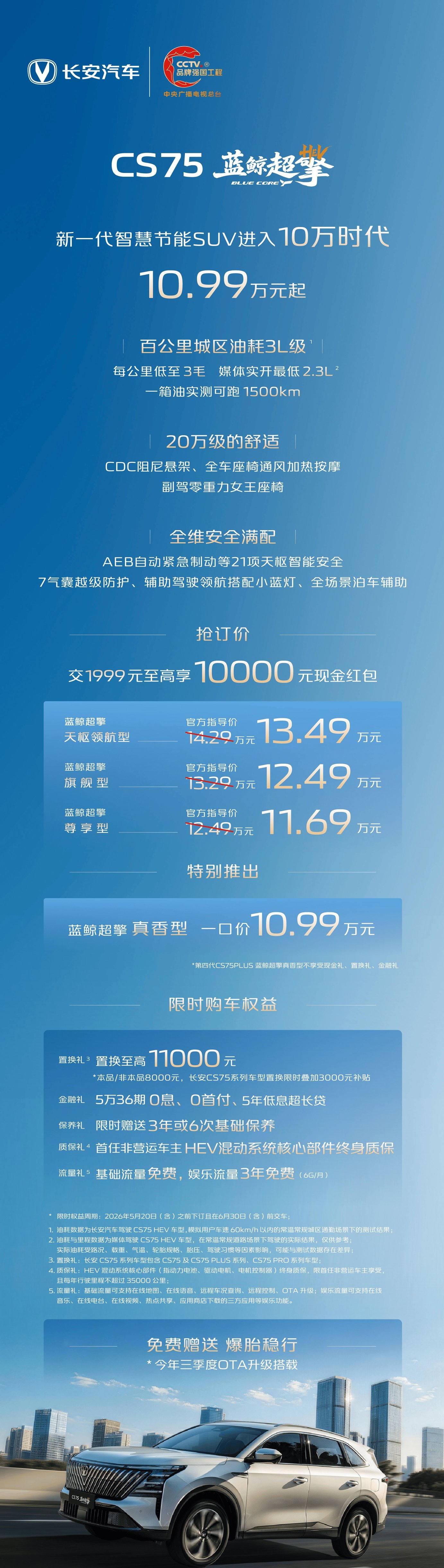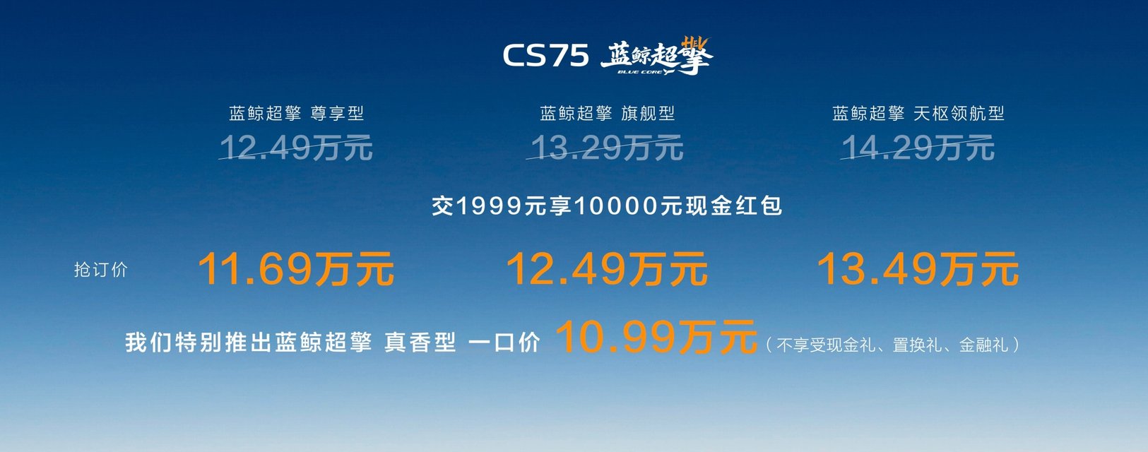第四代CS75PLUS蓝鲸超擎发布抢订价:交1999元至高享10000元现金红包,蓝鲸超擎尊享型11.69万元、蓝鲸超擎旗舰型12.49万元、蓝鲸超擎天枢领航型13.49万元,并特别推出蓝鲸超擎真香型一口价10.99万元(不享受现金礼、置换礼、金融礼);除蓝鲸超擎真香型外,购其他配置车型用户可享五大限时购车权益:置换礼:置换至高11000元(本品/非本品8000元,长安CS75系列车型置换限时叠加3000元补贴);金融礼:5万36期0息、0首付、5年低息超长贷;保养礼:限时赠送3年或6次基础保养;质保礼:首任非营运车主HEV混动系统核心部件终身质保;流量礼:基础流量免费,娱乐流量3年免费(6G/月)。