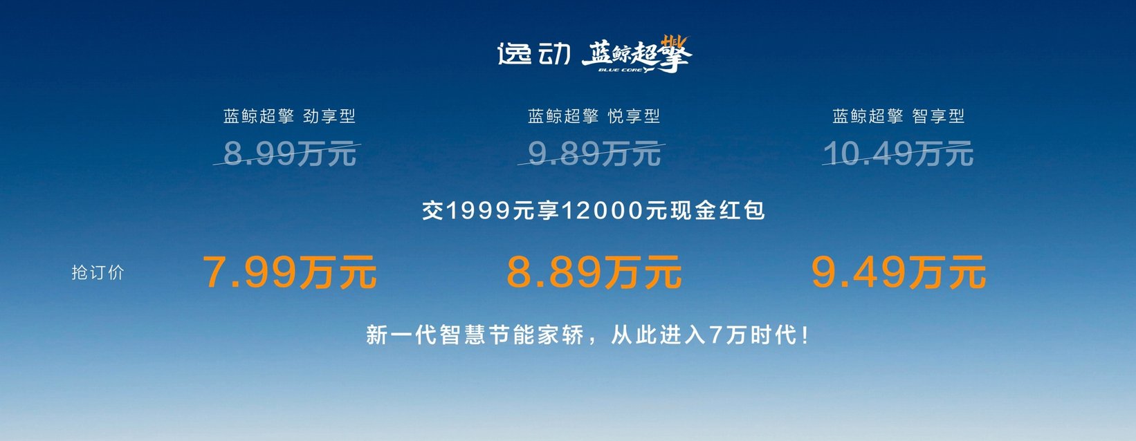 第四代逸动蓝鲸超擎发布抢订价:交1999元享12000元现金红包,蓝鲸超擎劲享型抢订价7.99万元、蓝鲸超擎悦享型抢订价8.89万元、蓝鲸超擎智享型抢订价9.49万元。购全系车型用户可享五大限时购车权益:置换礼:置换至高7000元(本品4000元,非本品2000元,长安逸动系列老客户限时叠加3000元补贴);金融礼:4万24期0息、0首付、5年低息超长贷;保养礼:限时赠送3年或6次基础保养;质保礼:首任非营运车主HEV混动系统核心部件终身质保;流量礼:基础流量免费,娱乐流量3年免费(6G/月)。