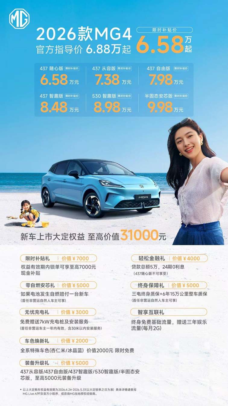 4月24日北京车展,2026款MG4正式上市。限时补贴价6.58万起,437km续航版本直接把价格拉到了6万级,530km长续航版8.98万起。这个价格一出,展台上的媒体都在议论:MG这是要把两厢纯电市场的桌子掀了。