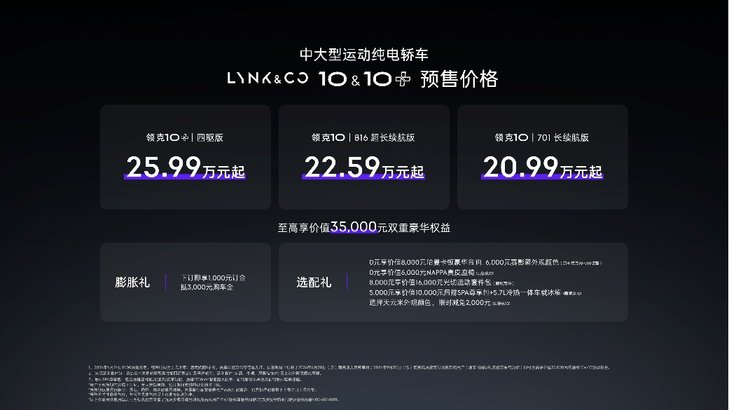 本届车展,备受期待的中大型运动纯电轿车——领克10+和10正式开启预售,共推出三个版型:领克10的701长续航版预售价20.99万元起,816超长续航版预售价22.59万元起;领克10+四驱版预售价为25.99万元起。预售期间下订可至高享价值35,000元双重豪华权益。此外,还可选装“弯道之王”加强件 Racing Package,价格为69,900元。领克10+和10将于今年5月正式上市。