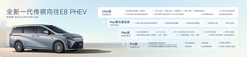 目前,全新传祺向往E8 PHEV已正式开启预订。为了满足用户的差异化需求,新车共推出PRO、MAX、MAX激光雷达和ULTRA四款配置版本。同时,还为预订用户提供了多重下订好礼。此外,所有新车用户都将享受到广汽传祺“三担责”政策的服务保障。