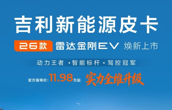 北京车展刚拉开大幕,吉利雷达就发布了2026款金刚EV正式上市,11.98万元起售。说实话,逛了这么多年车展,很少见一款皮卡能让消费者眼睛都亮的,这次吉利是真摸到了创富人群的核心需求。