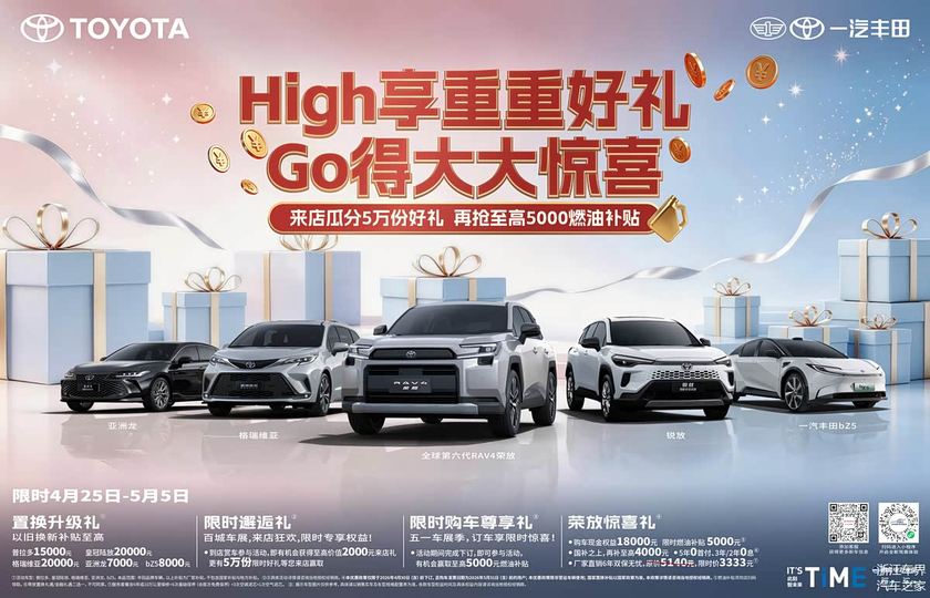 五一长假将至,正是自驾出游、奔赴山海的好时机,不少消费者计划添置新车,解锁舒适自在的假日出行。恰逢北京车展火热启幕,一汽丰田顺势推出重磅福利,开启4 月25日-5月5日“High 享重重好礼,Go 得大大惊喜”主题活动,超多限时礼遇轮番登场,助力消费者轻松焕新座驾,安心畅游五一。