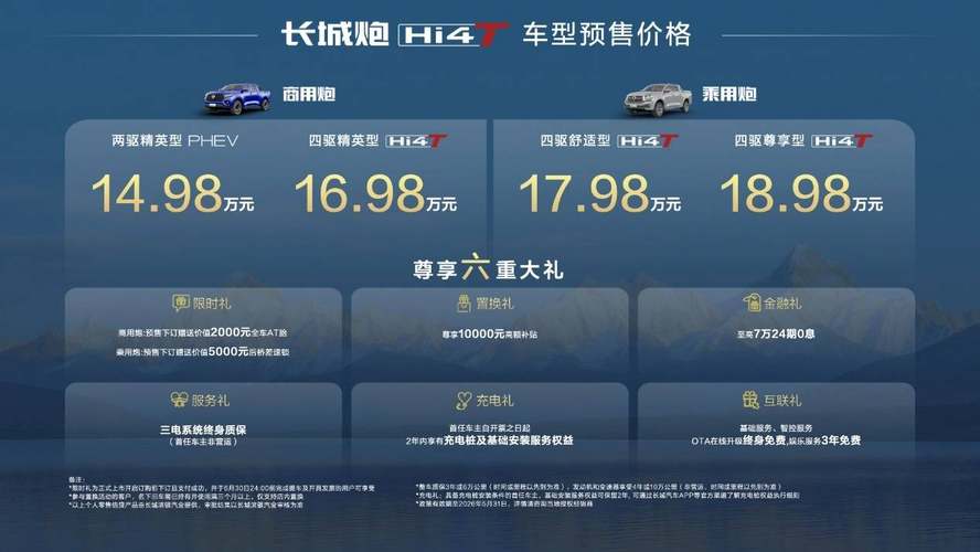 “真新能源皮卡”硬核登场。4月24日,北京车展上,全球智能电混皮卡长城炮Hi4-T重磅开启预售。本次预售推出多款配置车型:商用炮两驱精英型PHEV官方预售价格为14.98万元,商用炮四驱精英型Hi4-T官方预售价格为16.98万元,乘用炮四驱舒适型Hi4-T官方预售价格为17.98万元,乘用炮四驱尊享型Hi4-T官方预售价格为18.98万元。购车即可享受六重大礼:10000元置换补贴、至高7万24期0息金融礼、三电系统终身质保服务礼、充电礼、互联礼,此外,商用炮预售期限时下订赠送价值2000元全车AT胎,乘用炮预售期限时下订赠价值5000元后桥差速锁,诚意拉满。