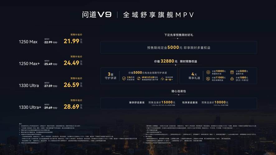 4月28日,这款承载“高端平权”使命的旗舰车型正式开启预售,预售补贴价为21.99万元-28.69万元,轻松解锁十大旗舰配置。值得注意的是,即日起下定问道V9,用户可享包含“三电系统终身质保、8年或15万公里电池衰减超限值只换不修、电池自燃烧一赔一”的3重守护承诺,以及价值10000元购置税补贴、价值5000元置换补贴、价值11000元用车保障权益、价值1880元先见·问道礼的四大尊享礼遇,限时预售权益总价值至高32880元,让消费者无需为产品溢价买单,直接坐拥全域舒享的豪华出行体验。
