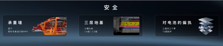安全性上,泰岳平台做了很多“傻实在”的事情。泰岳平台首次把军车车身设计标准搬到了一台MPV上,打造车上的“承重墙”;地板七横六纵结构,足足做了“三层地基”。另外,电池开发过程对安全品质的追求近乎偏执:电芯生产原材料追求“零杂质”、制造过程力求“零缺陷”、电芯成组强调“零短板”。不仅如此,电池包还做了15层的立体硬防护结构;面对特殊情况,电芯侧面都包了一层能耐1000℃高温的航空级隔热材料,顶部还有一层耐1200℃陶瓷化阻燃结构,给每个电芯筑成了一个“安全屋”。