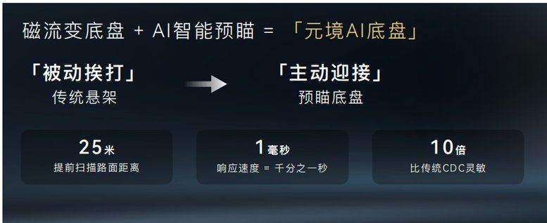 稳定性上,泰岳平台死磕技术工程,通过“磁流变底盘+AI智能预瞄”,打造元境AI底盘。区别于传统悬架的“被动挨打”,元境AI底盘实现“主动迎接”。摄像头和雷达会提前扫描车前方 25 米左右的路面,通过 AI 模型准确区分减速带、甚至道路接缝或碎裂凸起,传递到悬架,悬架里的磁流变液会在磁场激励下,在 1 毫秒的时间内改变硬度。在车轮轧上去之前,悬架就已经做好了准备。