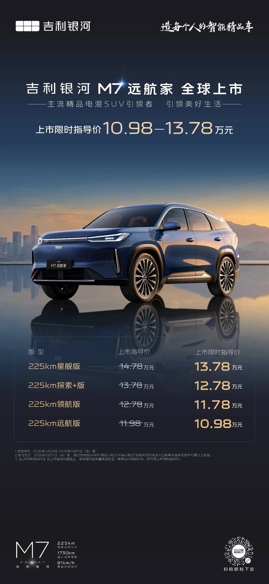 4月28日,吉利银河M7远航家正式上市,限时指导价10.98万至13.78万,共四个配置。一台紧凑型插混SUV,把纯电续航225公里做成了全系标配,29.8度电池包不分高低配,入门版和顶配版在核心三电上完全一致。这个定价策略传递的信号很明确:吉利不想在这个细分市场做跟随者。