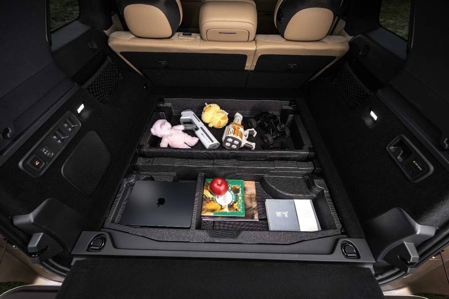 后备箱的变化更明显。标准状态下容积1030L,把二排座椅前移后可以达到1215L,放倒后排座椅后扩展到2568L。作为对比,很多中型SUV的后备箱标准容积在500-600L左右。领克900五座版的后备箱还做了下沉式设计,额外提供了80L的隐藏储物空间。另外,五座版保留了六座版上的天地门设计,这种上下对开的尾门在户外场景下确实比传统掀背门更实用,比如可以坐在下尾门上钓鱼或者休息。