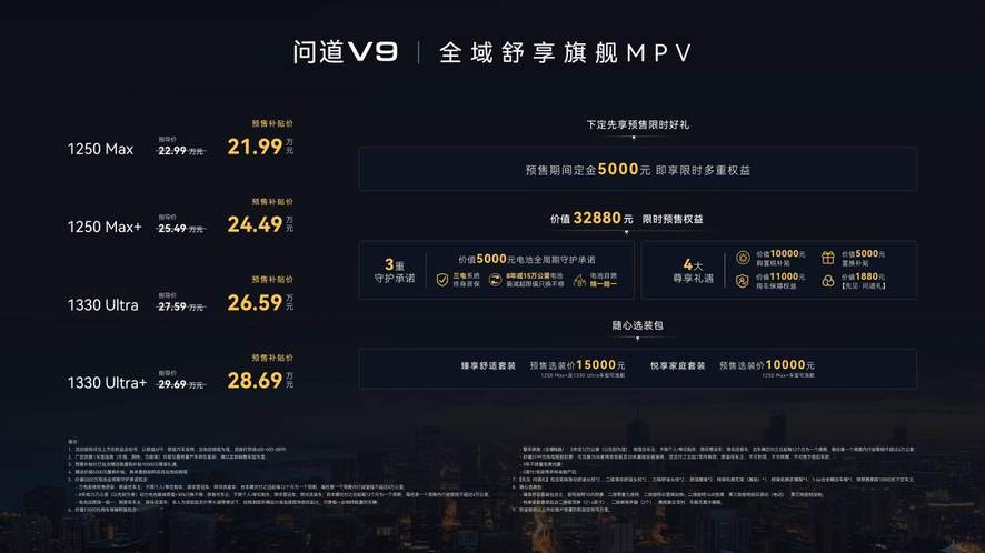 此次预售,极狐问道V9诚意拉满,不仅以亲民定价打破高端MPV的价格壁垒,更推出多重重磅权益与守护承诺。即日起下定的用户,可享受“三电系统终身质保、8年或15万公里电池衰减超限值只换不修、电池自燃烧一赔一”3重安心守护,彻底打消用车顾虑;同时可叠加四大尊享礼遇,包括价值10000元购置税补贴、5000元置换补贴、11000元用车保障权益及1880元先见·问道礼,全方位降低购车与用车成本,让每一位用户都能轻松解锁旗舰级体验。